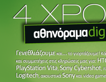 Το Αθηνόραμα Digital κλείνει τα 4 χρόνια του και διοργανώνει μεγάλο διαγωνισμό και σας δίνει τη δυνατότητα να κερδίσετε ένα HTC One, ένα Playstation 3, ένα Playstation Vita, μια Sony Cybershot, περιφερειακά/ αξεσουάρ Logitech, ακουστικά Sony και video games για PS3 και PS Vita!