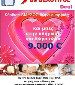 Τα Be Beautiful διοργανώνουν διαγωνισμό στο facebook και σας δίνουν τη δυνατότητα να κερδίσετε 3 δώρα αξίας 9.000€: Ετήσιο πρόγραμμα αισθητικής αξίας 3.000€, ετήσιο πρόγραμμα αποτρίχωσης αξίας 3.000€, ετήσιο πρόγραμμα αδυνατίσματος αξίας 3.000€.