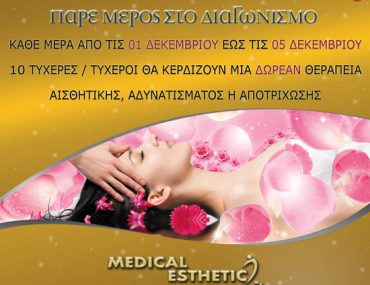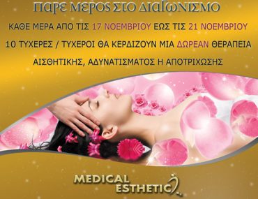 Κάθε μέρα από τις 17 Νοεμβρίου έως τις 21 Νοεμβρίου 10 τυχερές / τυχεροί θα κερδίζουν μια δωρεάν θεραπεία Αισθητικής, Αδυνατίσματος ή Αποτρίχωσης.
