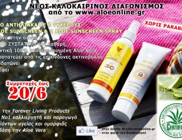 Η σελίδα Forever Living: Το σπίτι της αλόης διοργανώνει διαγωνισμό και δίνει τη δυνατότητα σε δύο τυχερούς να κερδίσουν ένα αντηλιακό Aloe Sunscreen και ένα Aloe Sunscreen Spray από την Forever Living Products, τον Νο1 καλλιεργητή και παραγωγό προϊόντων υγείας και ομορφιάς με βάση την Aloe Vera!