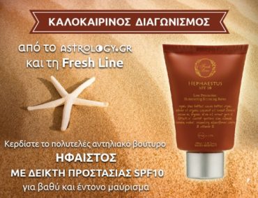 Το Astrology.gr σε συνεργασία με τη Fresh Line, χαρίζουν σε 10 τυχερές το πολυτελές αντηλιακό Βούτυρο Ήφαιστος με δείκτη προστασίας SPF10, για βαθύ και έντονο μαύρισμα.