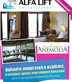 Η εταιρία ALFA LIFT Ανελκυστήρες διοργανώνει διαγωνισμό και σας δίνει τη δυνατότητα να κερδίσετε 3 ημέρες / 2 διανυκτερεύσεις για 2 άτομα σε δίκλινο Standard δωμάτιο στην Αράχωβα.