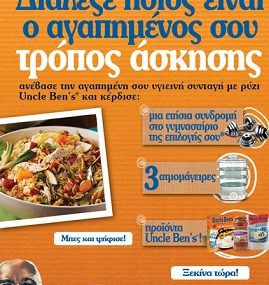 Η σελίδα Uncle Ben’s Greece διοργανώνει διαγωνισμό και δίνει τη δυνατότητα σε ένα τυχερό να κερδίσει μία συνδρομή σε γυμναστήριο επιλογής του ή σε οποιοδήποτε άλλο είδος άθλησης αυτός επιλέξει, μέχρι του ποσού των τριακοσίων πενήντα Ευρώ (350€) ετησίως συμπεριλαμβανομένου του ΦΠΑ και σε 3 ακόμα, να κερδίσουν 3 ατμομάγειρες Tefal. Επιπλέον 3 τυχεροί κάθε εβδομάδα θα κερδίζουν προϊόντα Uncle Ben.