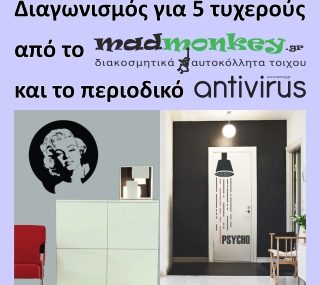 To Madmonkeys.gr και το περιοδικό Antivirus προσφέρουν από ένα πρωτότυπο δώρο σε 5 τυχερούς. Τα αυτοκόλλητα τοίχου, την νέα τάση στη διακόσμηση, που έφτασε και μάλιστα έχει «στρογγυλοκαθίσει» σε τοίχους, πόρτες, έπιπλα και οποιασδήποτε φύσεως λεία επιφάνεια.