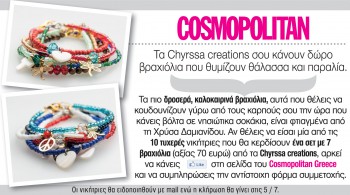 Τα πιο δροσερά, καλοκαιρινά βραχιόλια, αυτά που θέλεις να κουδουνίζουν γύρω από τους καρπούς σου την ώρα που κάνεις βόλτα σε νησιώτικα σοκάκια, είναι φτιαγμένα από τη Χρύσα Δαμιανίδου. Αν θέλεις να είσαι μία από τις 10 τυχερές νικήτριες που θα κερδίσουν ένα σετ με 7 βραχιόλια (αξίας 70 ευρώ) από τα Chyrssa creations, αρκεί να κάνεις Like στη σελίδα του Cosmopolitan Greece και να συμπληρώσεις την αντίστοιχη φόρμα συμμετοχής.