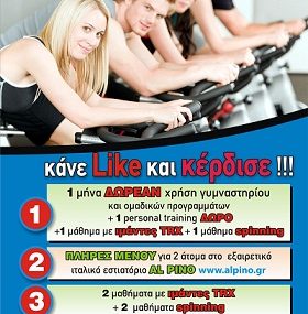 To γυμναστήριο Body&Soul διοργανώνει διαγωνισμό και σας δίνει τη δυνατότητα να κερδίσετε 1ος νικητής: 1 μήνα δωρεάν χρήση γυμναστηρίου και ομαδικών προγραμμάτων, 1 personal training δώρο, 1 μάθημα με ιμάντες TRX και 1 μάθημα spinning. 2ος νικητής: ένα πλήρες μενού για 2 άτομα στο εξαιρετικό ιταλικό εστιατόριο AL PINO και 3ος νικητής 2 μαθήματα με ιμάντες TRX και 2 μαθήματα spinning.