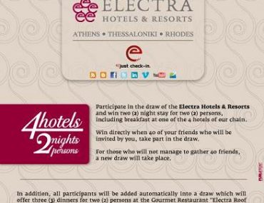 Το Electra Hotels & Resorts διοργανώνει διαγωνισμό και δίνει τη δυνατότητα σε 3 τυχερούς να κερδίσουν 2 διανυκτερεύσεις για 2 άτομα με πρωινό σε 1 από τα 4 ξενοδοχεία της αλυσίδας. Επιπλέον για όλες τις συμμετοχές θα κληρωθούν 3 δείπνα για 2 άτομα στο εστιατόριο “Electra Roof Garden” στο ξενοδοχείο “Electra Palace Athens” και στο εστιατόριο “Orizontes Pool Bar & Restaurant” στο ξενοδοχείο “Electra Palace Thessaloniki”.