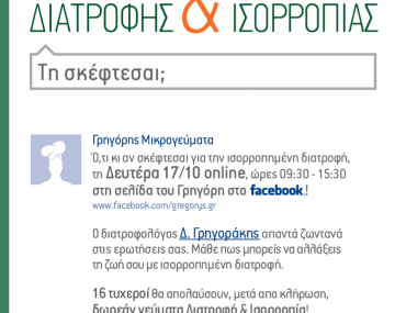 Τα Γρηγόρης Μικρογεύματα διοργανώνου διαγωνισμό και σας δίνουν τη δυνατότητα να κερδίσετε 16 δωρεάν γεύματα Διατροφή & Ισορροπία και Online συζήτηση με το διατροφολόγο Δ. Γρηγοράκη.