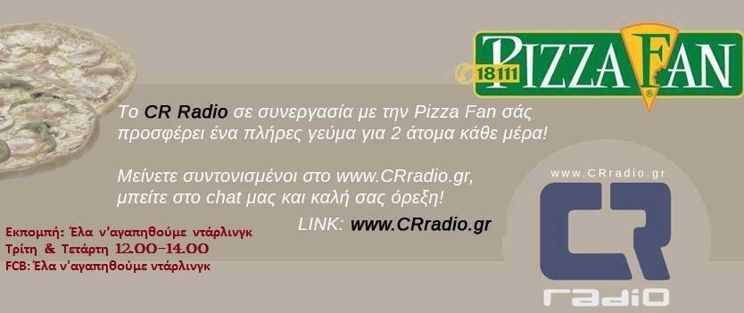 Κάθε εβδομάδα από Δευτέρα μέχρι και Παρασκευή το www.CRradio.gr μέσω των εκπομπών του, δίνει 1 γεύμα για 2 άτομα από την Pizza Fan. Το γεύμα περιλαμβάνει δύο (2) πίτσες των 8 τεμαχίων και ένα Choco KRATS.
