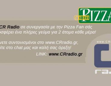 Από την Δευτέρα 20 Οκτωβρίου μέχρι και την Παρασκευή 24 Οκτωβρίου το www.CRradio.gr μέσω των εκπομπών του, δίνει 1 γεύμα για 2 άτομα από την Pizza Fan. Το γεύμα περιλαμβάνει 2 πίτσες των 8 τεμαχίων και ένα Choco KRATS ή μία Μπουγάτσα KRATS.