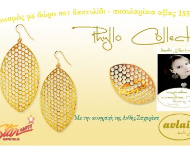 Τα χειροποίητα κοσμήματα Αυλαία και το HappyStar σας κάνουν δώρο 1 σετ σκουλαρίκια και δαχτυλίδι από τη σειρά Phyllo Collection, συνολικής αξίας 156 ευρώ με την υπογραφή της Ανθής Ζαχαράκη.