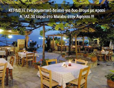 Η σελίδα Marabu Afissos διοργανώνει διαγωνισμό και σας δίνει τη δυνατότητα να κερδίσετε ένα ρομαντικό δείπνο για δυο άτομα με κρασί αξίας 30 ευρώ στο Marabu στην Άφησσο!