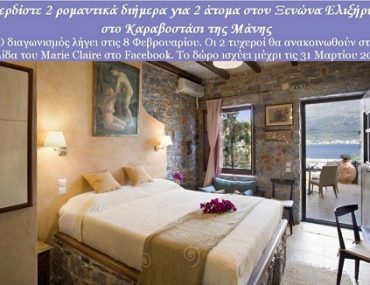 Η σελίδα Marie Claire Greece διοργανώνει διαγωνισμό και σας δίνει τη δυνατότητα να κερδίσετε 2 ρομαντικά διήμερα για 2 άτομα στον Ξενώνα Ελιξήριον στο Καραβοστάσι της Μάνης.