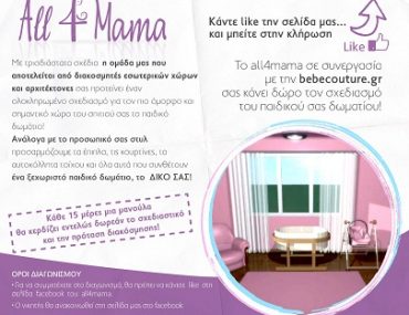 Mε τρισδιάστατα σχέδια το all4mama σε συνεργασία με τη bebecouture σας προτείνει έναν ολοκληρωμένο σχεδιασμό για τον πιο όμορφο και σημαντικό χώρο του σπιτιού σας το παιδικό δωμάτιο. Ανάλογα με το προσωπικό σας στυλ προσαρμόζουμε τα έπιπλα, τις κουρτίνες, τα αυτοκόλλητα τοίχου και όλα αυτά που συνθέτουν ένα ξεχωριστό παιδικό δωμάτιο, το ΔΙΚΟ ΣΑΣ.