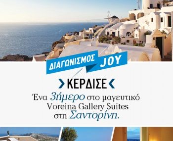 Το Joy σου δίνει την ευκαιρία να απολαύσεις ένα μοναδικό 3ήμερο, κερδίζοντας διαμονή – 2 διανυκτερεύσεις για 2 άτομα σε Superior Suite, με ιδιωτική εξωτερική θερμαινόμενη πισίνα με υδρομασάζ – κατόπιν διαθεσιμότητας, στο υπέροχο Voreina Gallery Suites (μέλος της Trésor Hotels & Resorts) στην Σαντορίνη.