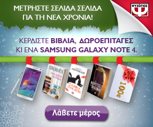 Οι εκδόσεις Ψυχογιός διοργανώνουν διαγωνισμό με τίτλο Μετράμε Σελίδα-Σελίδα για τη νέα χρονιά και σας δίνουν τη δυνατότητα να κερδίσετε 1 Samsung Galaxy Note 4, 3 δωροεπιταγές αξίας 100€ για ατελείωτο διάβασμα και επιπλέον 20 αγαπημένα βιβλία ή ebooks καθημερινά!