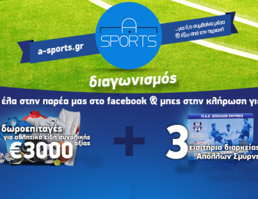 Το a-sports.gr προσφέρει έπειτα από κλήρωση εντελώς δωρεάν 50 αθλητικά είδη με δωροεπιταγές συνολικής αξίας 3.000 ευρώ και 3 εισιτήρια εισιτήρια διαρκείας της ΠΑΕ Απόλλων Σμύρνης για τη Σούπερ Λίγκα της σεζόν 2013-14 συνολικής αξίας 600 ευρώ (200 ευρώ η κάθε κάρτα).