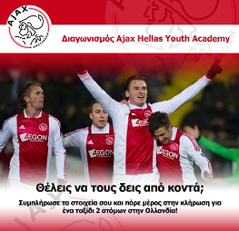 Οι ακαδημίες του Ajax στην Ελλάδα δίνουν τη δυνατότητα σε ένα τυχερό νικητή να ταξιδέψει στην Ολλανδία και να δει την ομάδα από κοντά με όλα τα έξοδα πληρωμένα. Το δώρο περιλαμβάνει αεροπορικά εισιτήρια, διαμονή στο Νovotel (2 διανυκτερεύσεις) και φυσικά εισιτήρια για τον αγώνα Αjax – VVV στο Amsterdam Arena (2/5/2012).