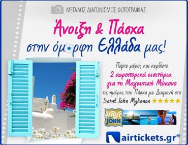 Το Airtickets.gr διοργανώνει διαγωνισμό και σας δίνει τη δυνατότητα να κερδίσετε 2 αεροπορικά εισιτήρια για τη Μαγευτική Μύκονο τις ημέρες του Πάσχα, με Διαμονή στο ξενοδοχείο 5 αστέρων Saint John Mykonos.