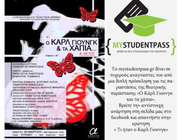 Το mystudentpass.gr δίνει σε τυχερούς αναγνώστες του από μια διπλή πρόσκληση για τις παραστάσεις της θεατρικής παράστασης <<Ο Καρλ Γιουνγκ και τα χάπια>>. Θα δίνεται από μια διπλή πρόσκληση για κάθε παράσταση.