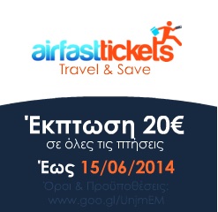 Η Airfasttickets.gr σας προσφέρει εκπτωτικό κουπόνι, για έκπτωση 20€ σε όλες τις πτήσεις αξίας ίσης ή μεγαλύτερης των 99€!