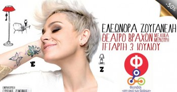 Η Ελεωνόρα Ζουγανέλη «πατάει γκάζι, μόνο γκάζι, τέρμα γκάζι…» στο συναυλιακό καλοκαίρι και κάνει στάση για μία μεγάλη συναυλία στο Θέατρο Βράχων «Μελίνα Μερκούρη», την Τετάρτη 3 Ιουλίου! Ο cheapis.gr σας προσφέρει εισιτήριο εισόδου για 1 άτομο, μόνο με 6€ (αξίας 12€ – έκπτωση 50%).