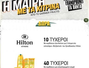 Η σελίδα Garnier Greece διοργανώνει διαγωνισμό και σας δίνει τη δυνατότητα να κερδίσετε 10 γεύματα στο εστιατόριο Βυζαντινό στο ξενοδοχείο Hilton και 40 σετ (σαμπουάν, κρέμα μαλλιών, περιποίηση στη στιγμή, μάσκα μαλλιών) της σειράς Fructis ΘΡΕΨΗ ΚΑΙ ΕΠΑΝΟΡΘΩΣΗ 3.