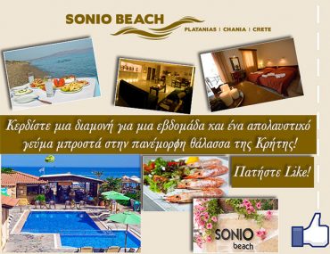 Το Sonio Beach διοργανώνει διαγωνισμό και σας δίνει τη δυνατότητα να κερδίσετε ένα μια εβδομάδα διαμονής στο Sonio Beach Apartments και ένα γεύμα στο εστιατόριο του ξενοδοχείου.