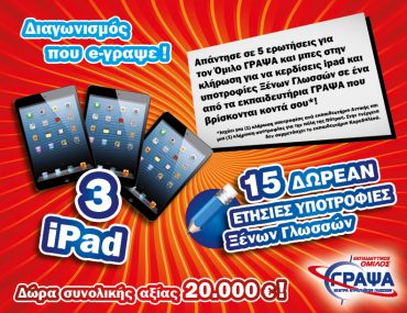Ο Εκπαιδευτικός Όμιλος Ξένων Γλωσσών ΓΡΑΨΑ διοργανώνει διαγωνισμό και σας δίνει τη δυνατότητα να κερδίσετε 3 ipad και 15 ετήσιες υποτροφίες Ξένων Γλωσσών!