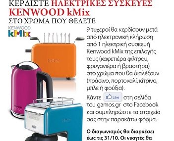 Το gamos.gr διοργανώνει διαγωνισμό και σας δίνει τη δυνατότητα να κερδίσετε 9 ηλεκτρικές συσκευές Kenwood Kmix της επιλογής σας (καφετιέρα φίλτρου, φρυγανιέρα ή βραστήρας) στο χρώμα που θα διαλέξετε (πράσινο, πορτοκαλί, κίτρινο, μπλέ ή φούξια).