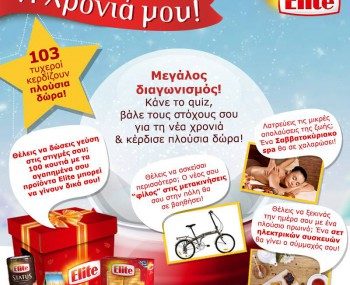 Η Elite διοργανώνει διαγωνισμό και σας δίνει τη δυνατότητα να κερδίσετε ένα σαββατοκύριακο για 2 άτομα στο Καρπενήσι, ένα «σπαστό» ποδήλατο πόλης Orbea, ένα σετ ηλεκτρικών συσκευών πρωινού Bosch και 100 κουτιά με προϊόντα ELITE.