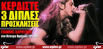 Το Ogdoo.gr εξασφάλισε για τους αναγνώστες του τρεις διπλές προσκλήσεις για τη συναυλία του Γιάννη Χαρούλη, το Σάββατο 01 Σεπτεμβρίου 2012, στο Θέατρο Βράχων.