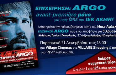 Από σήμερα, οι φίλοι της σελίδας του ΙΕΚ Ακμή θα έχουν την μοναδική ευκαιρία να παρακολουθούν, σε πανελλήνια πρώτη και εντελώς δωρεάν, τις μεγαλύτερες ελληνικές ή ξένες παραγωγές της VILLAGE FILMS. Η αρχή γίνεται με την ταινία: Επιχείρηση ARGO (ΜΠΕΝ ΑΦΛΕΚ), Υποψήφιας για Όσκαρ Σκηνοθεσίας και Α’ Ανδρικού ρόλου, την Παρασκευή 21 Δεκεμβρίου 2012, 18.00 μμ, στο VILLAGE PARK Ρέντη.