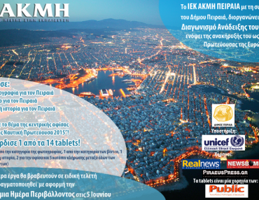 Το ΙΕΚ ΑΚΜΗ ΠΕΙΡΑΙΑ σε συνεργασία με το Δήμο Πειραιά διοργανώνει Μεγάλο Διαγωνισμό Ανάδειξης του Πειραιά ενόψει της ανακήρυξής του ως Ναυτικής Πρωτεύουσας της Ευρώπης 2015 και χαρίζει 14 υπέροχα tablets, προσφορά των καταστημάτων Public.