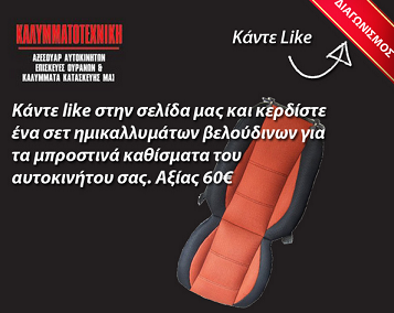 Η Καλυμματοτεχνική διοργανώνει διαγωνισμός και σας δίνει τη δυνατότητα να κερδίσετε 1 σετ βελούδινα ημικαλύμματα για τα μπροστινά καθίσματα του αυτοκινήτου.