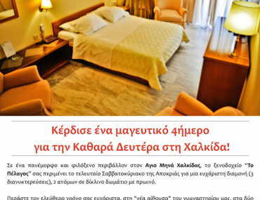 Το Hotel Pelagos διοργανώνει διαγωνισμό και σας δίνει τη δυνατότητα να κερδίσετε διαμονή το 4ήμερο (3 διανυκτερεύσεις) Αποκριών και Καθαράς Δευτέρας, στο πανέμορφο περιβάλλον του ξενοδοχείου στη Χαλκίδα για 2 άτομα σε δίκλινο δωμάτιο με πρωινό!