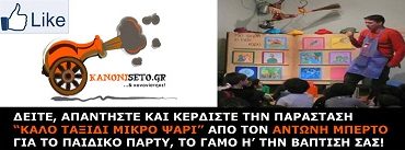 Το kanoniseto.gr διοργανώνει διαγωνισμό και σας δίνει τη δυνατότητα να κερδίσετε την παράσταση “καλό ταξίδι μικρό ψάρι” από τον ηθοποιό-ανιματέρ Αντώνη Μπέρτο, για το παιδικό πάρτυ, την βάπτιση ή και τον γάμο σας.