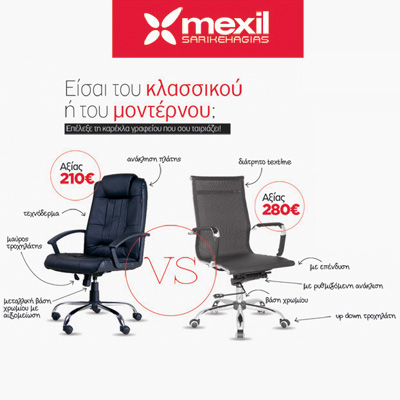 Πάρε μέρος τώρα στον διαγωνισμό της Mexil στο Facebook και κέρδισε μια καρέκλα γραφείου με άψογη αισθητική σε κλασσική ή μοντέρνα γραμμή.