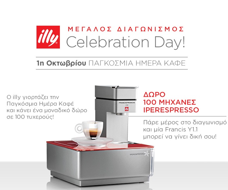 Ο καφές illy διοργανώνει διαγωνισμό και δίνει τη δυνατότητα σε 100 τυχερούς να κερδίσουν από μία μηχανή παρασκευής espresso για κάψουλες Francis Y1.1., σε όποιο χρώµα επιλέξουν οι νικητές!