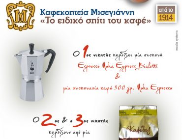 Η σελίδα misseyannis.gr διοργανώνει διαγωνισμό και δίνει τη δυνατότητα στον 10 νικητή να κερδίσει ένα εσπρέσσο Bialetti Moka Express 3 φλιτζανιών μαζί με 300 γραμμάρια καφέ Moka Espresso, ενώ ο δεύτερος και ο τρίτος νικητής κερδίζουν από 200 γραμμάρια καφέ της επιλογής τους!
