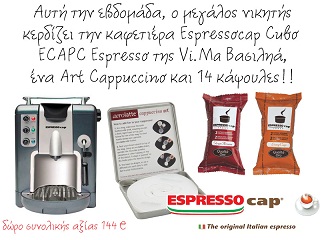Οι Αφοί Κολομβούνη διοργανώνουν διαγωνισμό και σας δίνουν τη δυνατότητα να κερδίσετε μια καφετιέρα Espressocap, ένα Art Cappuccino και 14 κάψουλες μέσα από τις 5 ποικιλίες καφέ που υπάρχουν της εταιρίας Vi.Ma Βασιληά, συνολικής αξίας 144 €.