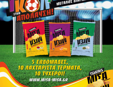 Η σελίδα TSAKIRIS Chips διοργανώνει διαγωνισμό και δίνει τη δυνατότητα σε 10 νικητές (κάθε εβδομάδα θα κληρώνονται 2 νικητές) να κερδίσουν 5 κιβώτια Tsakiris ΜΙΣΑ ΜΙΣΑ, τα οποία ισούνται σε ποσότητα όσα φιλέτα chips περιέχει το εμβαδό ενός τέρματος γηπέδου ποδοσφαίρου διαστάσεων 7,32 μέτρα σε πλάτος επί 2,44 μέτρα σε μήκος