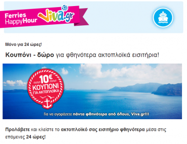 Προλάβετε και κλείστε το ακτοπλοϊκό σας εισιτήριο από το Viva.gr μέσα στις επόμενες 24 ώρες και κερδίστε ένα κουπόνι 10 Ευρώ!