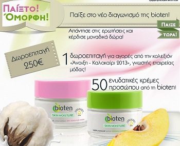 Η bioten διοργανώνει το διαγωνισμό «Παίξτο! Όμορφη!» και δίνει τη δυνατότητα σε 1 τυχερό να κερδίσει μια δωροεπιταγή 250 ευρώ για αγορές από την κολεξιόν «’Ανοιξη – Καλοκαίρι 2013», γνωστής εταιρείας μόδας και σε άλλους 50 να κερδίσουν από μία κρέμα bioten της επιλογής τους, της σειράς Skin Moisture.