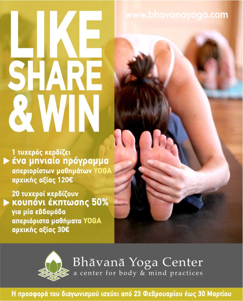 Το Bhavana Yoga Center διοργανώνει διαγωνισμό και σας δίνει τη δυνατότητα να κερδίσετε ένα μηνιαίο πρόγραμμα απεριόριστων μαθημάτων YOGA αξίας 120€.