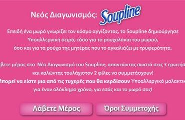 Το Soupline διοργανώνει διαγωνισμό και σας δίνει τη δυνατότητα να κερδίσετε τρία (3) μαλακτικά ρούχων Soupline Υποαλλεργικό 750ml και τέσσερα (4) μαλακτικά ρούχων Soupline Softness & Wellbeing, που αντιστοιχούν σε περισσότερο από την ποσότητα μαλακτικού ρούχων που καταναλώνει κατά μέσο όρο ένα ελληνικό νοικοκυριό σε διάστημα ενός (1) χρόνου (σύμφωνα με στοιχεία Homepanel της εταιρείας AC Nielsen για το χρονικό διάστημα 2010) ανά συμμετέχοντα-νικητή.