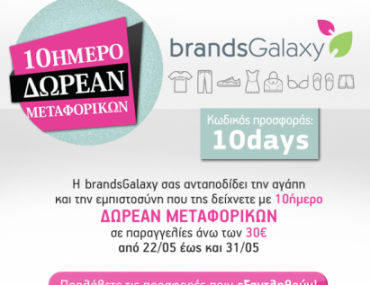 Η BrandsGalaxy σας ανταποδίδει την αγάπη και την εμπιστοσύνη που της δείχνετε με 10ήμερο ΔΩΡΕΑΝ μεταφορικών, σε παραγγελίες άνω των 30€! Μπορείτε πλέον να κάνετε τα ψώνια σας σε ρούχα Lynne και Zic Zac, ρολόγια GF FERRE,Lotus και Cerruti, παπούτσια Parex και Shoe Bizz και πολλά ακόμα χωρίς να πληρώσετε μεταφορικά!