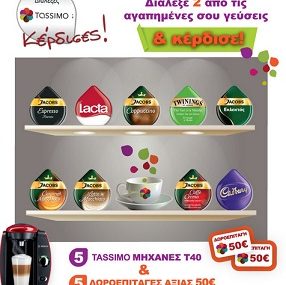 Η σελίδα Tassimo Greece διοργανώνει διαγωνισμό και σας δίνει τη δυνατότητα να κερδίσετε 5 μηχανές TASSIMO T40 και 5 δωροεπιταγές των 50 ευρώ για αγορές προϊόντων TASSIMO.