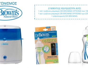 Το all4mama.gr διοργανώνει διαγωνισμό και σας δίνει τη δυνατότητα να κερδίσετε 2 αποστειρωτές DR BROWN’S, 2 σετ γυάλινων μπιμπερό 150ml και 2 σετ γυάλινων μπιμπερό 270 ml!