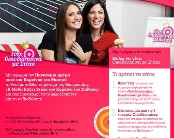 Το Veet υποστηρίζει ενεργά την εκστρατεία «Η Μόδα Βάζει Στόχο τον Καρκίνο του Στήθους» και σας προσκαλεί να γίνετε Οικοδέσποινα με Στόχο. Κάντε like στην facebook fan page του Veet, κάντε tag τον εαυτό σας σε μια από τις φωτογραφίες του album “Διαγωνισμός: Οικοδέσποινα με Στόχο” και μπείτε στην κλήρωση για να γίνετε Οικοδέσποινα. 5 τυχερές κερδίζουν από ένα μπλουζάκι του “Στόχου” και μια σειρά προϊόντων Veet.